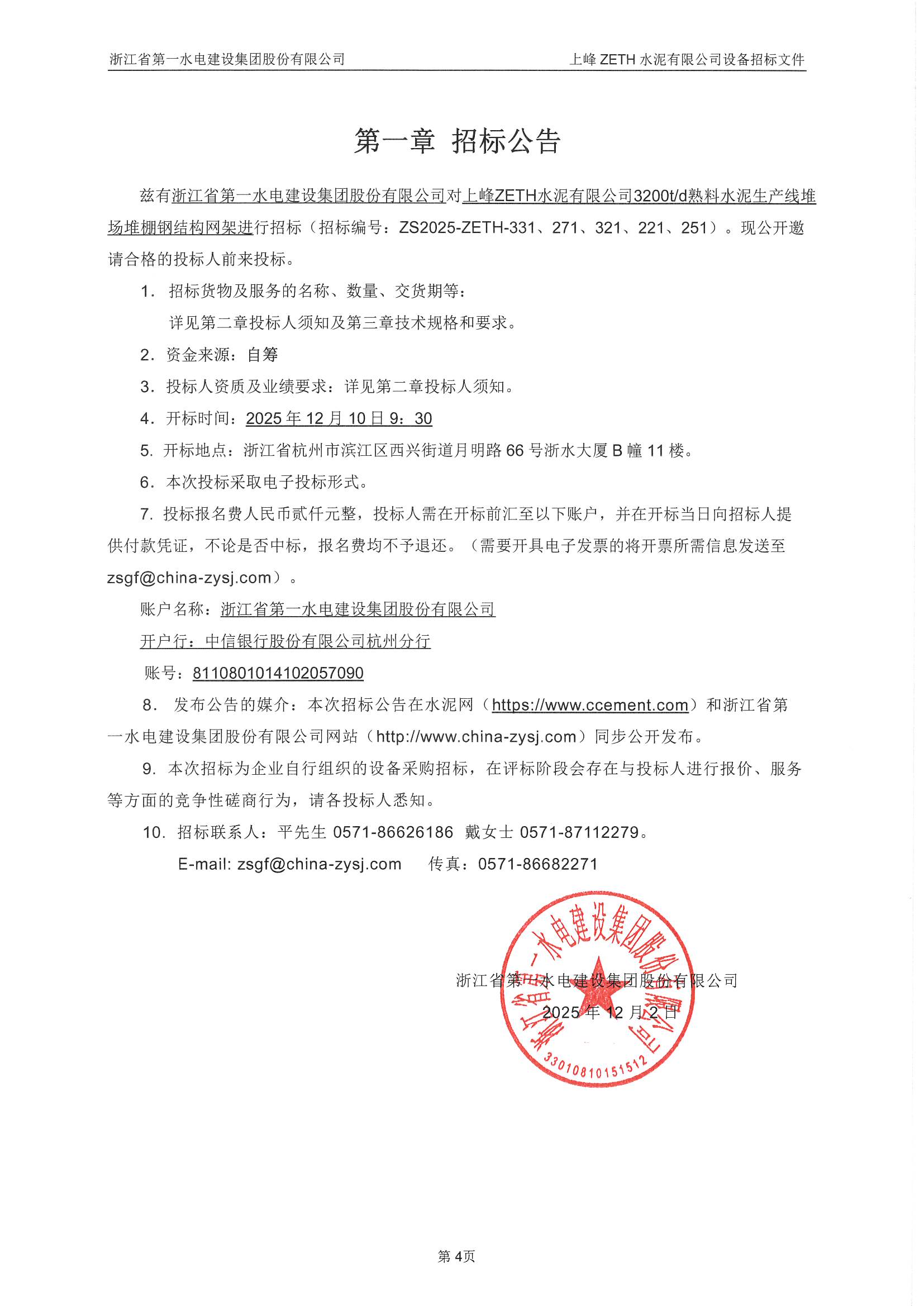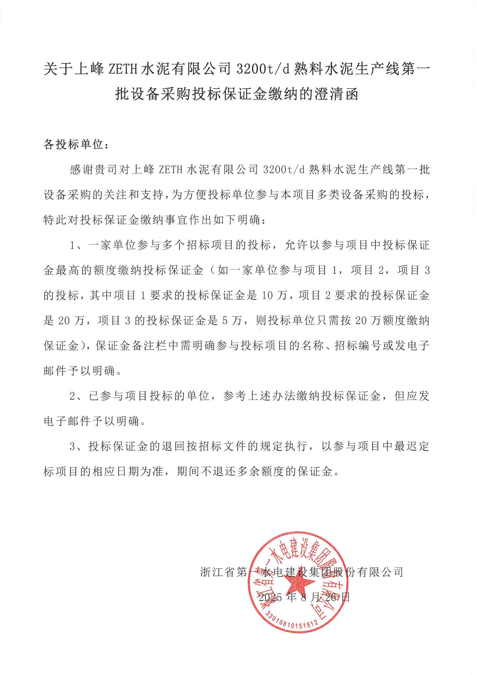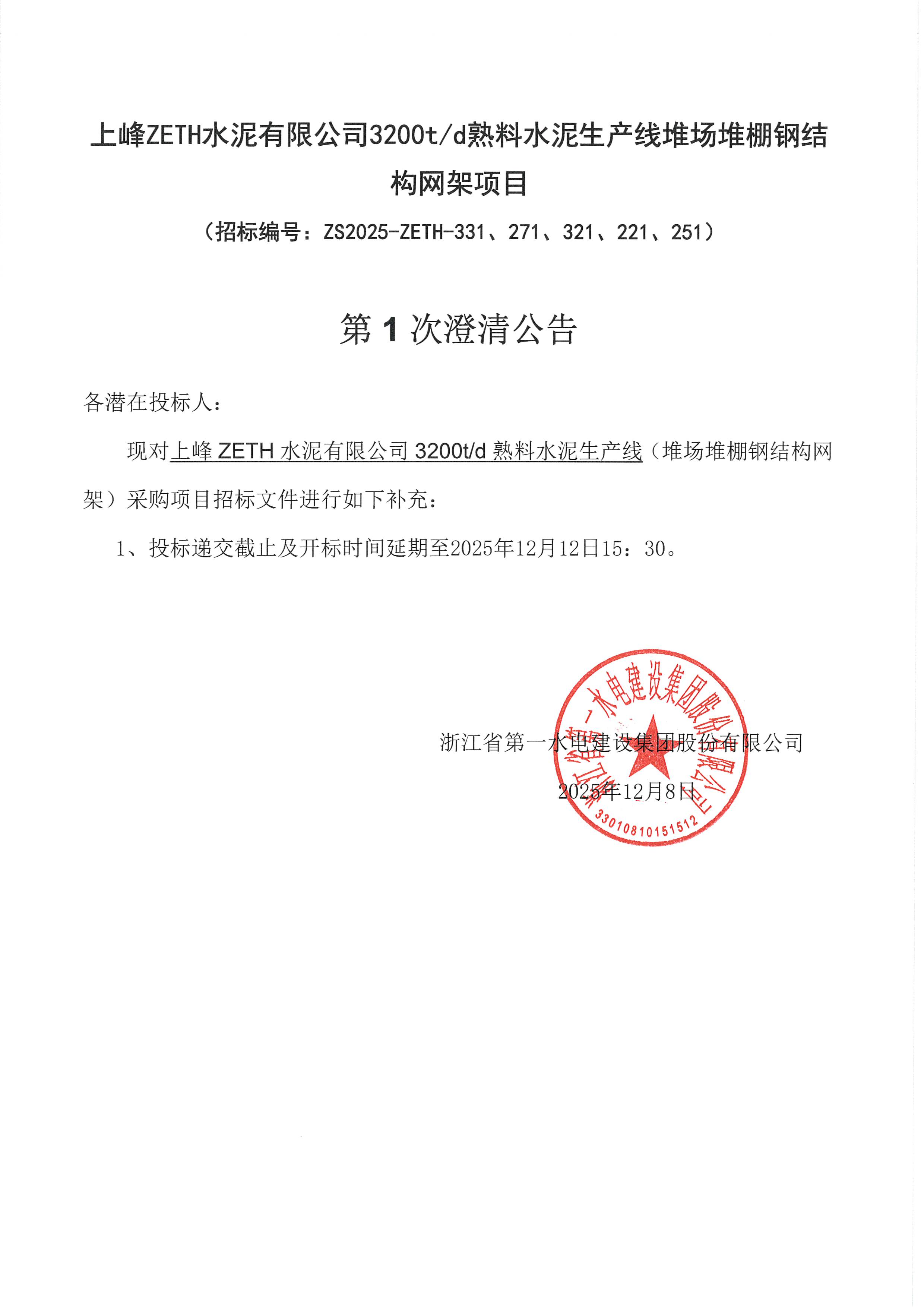 上峰ZETH水泥有限公司3200t/d熟料水泥生產線堆場堆棚鋼結構網架項目第1次澄清公告