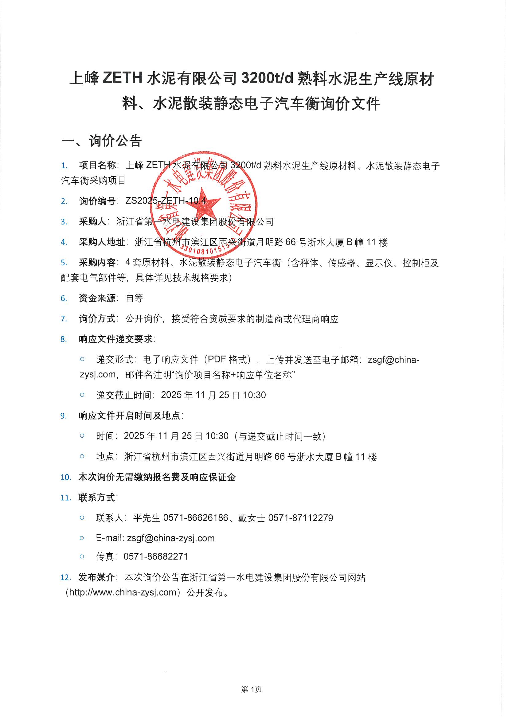 上峰ZETH水泥有限公司3200t/d熟料水泥生產線原材料、水泥散裝靜態(tài)電子汽車衡詢價公告